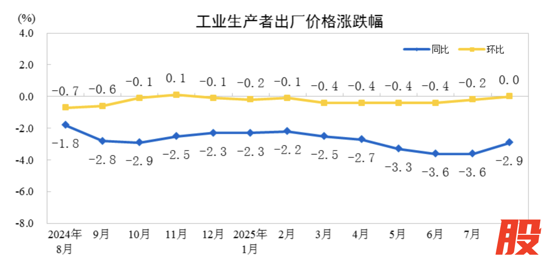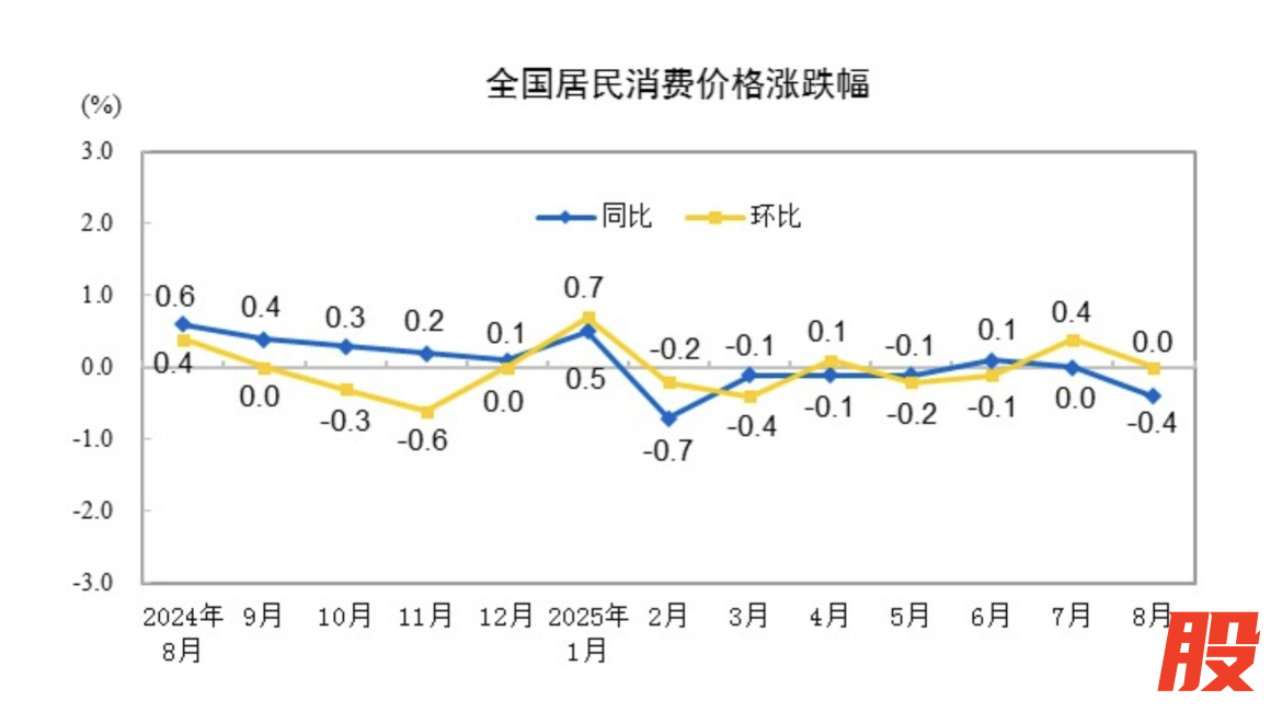 国家统计局9月10日发布的数据显示,8月CPI环比持平,同比下降0.4%。PPI环比由7月下降0.2%转为持平;同比下降2.9%,降幅比7月收窄0.7个百分点。