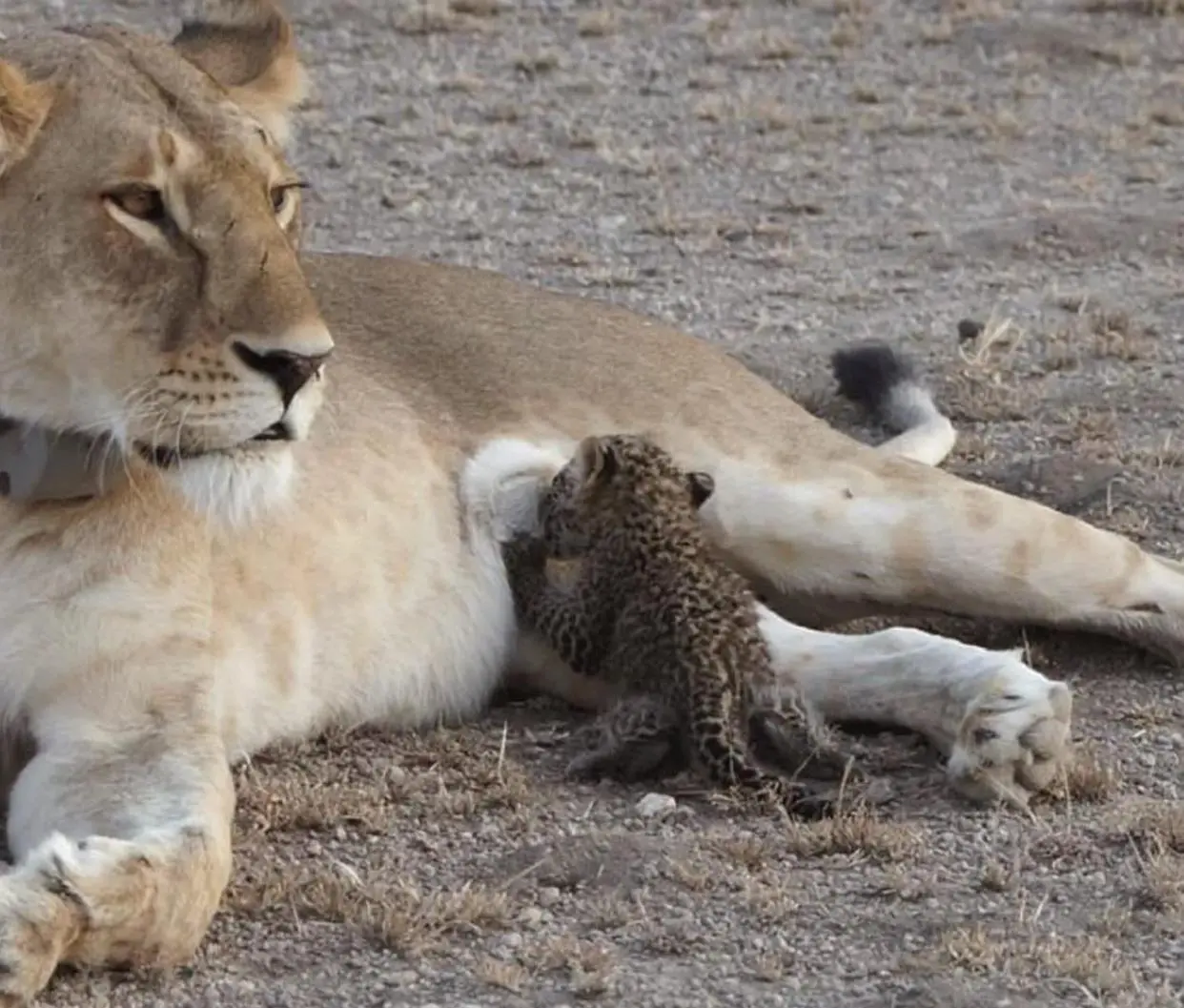 一只还没断奶的小花豹趴在母狮身上狠狠地干饭,母狮很放松地躺在地上,任由花豹宝宝吸奶。因为压根没有抢奶喝的,小花豹喝得相当放松,时不时还东张西望一下。